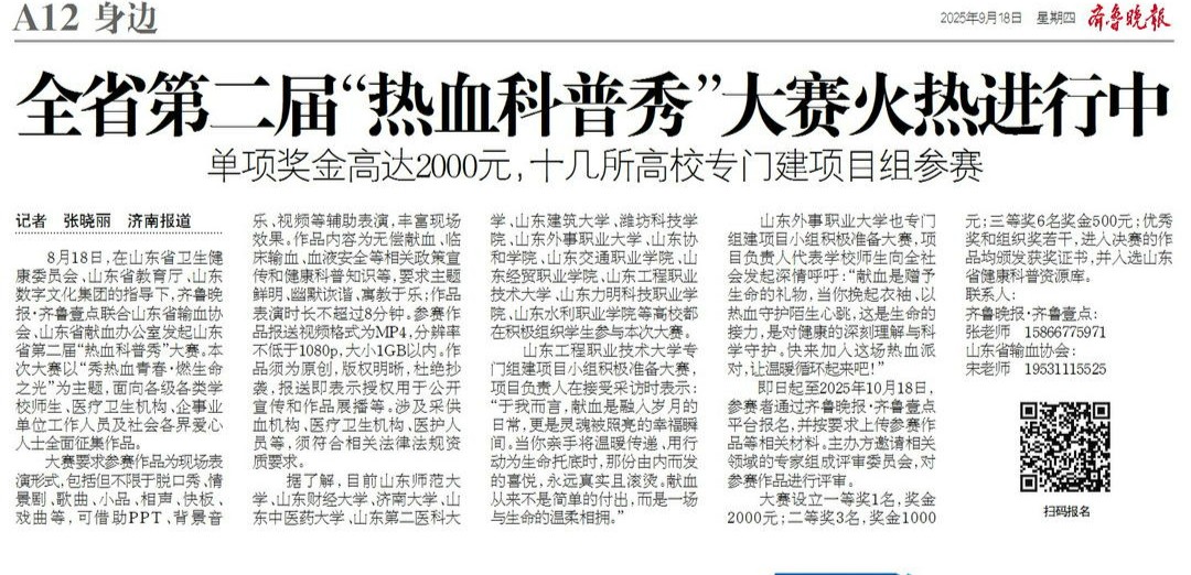 为进一步科学普及无偿献血和血液安全知识,提升公众健康素养,营造无偿献血良好社会氛围,2025年8月18日,在山东省卫生健康委员会、山东省教育厅、山东数字文化集团的指导下,齐鲁晚报·齐鲁壹点联合山东省输血协会、山东省献血办公室发起山东省第二届“热血科普秀”大赛。本次大赛以“秀热血青春·燃生命之光”为主题,面向各级各类学校师生、医疗卫生机构、企事业单位工作人员及社会各界爱心人士全面征集作品。