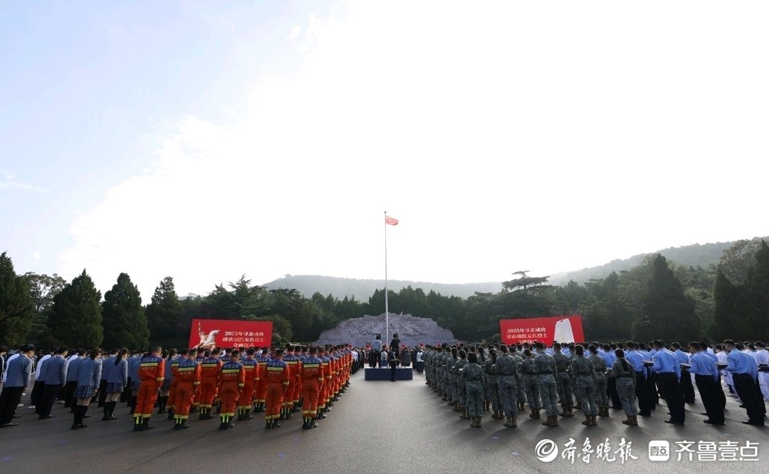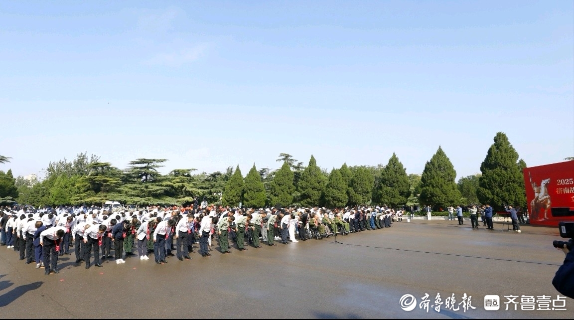 上午9时,仪式正式开始,济南革命烈士陵园英雄广场庄严肃穆,全体人员齐声高唱中华人民共和国国歌,激昂的旋律在苍松翠柏间回荡。国歌唱毕,全场肃立,向济南战役牺牲的革命烈士默哀致敬。
