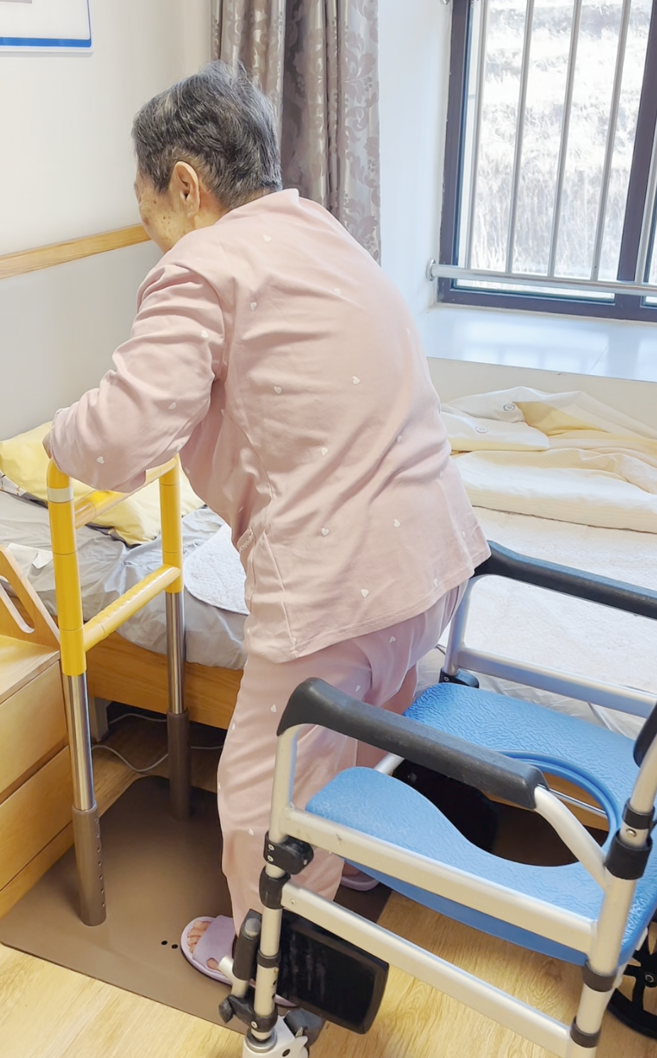 借助床边的助力器,李勇的母亲能够自己站起身。