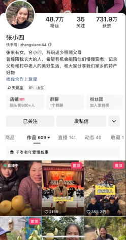 张欣是一名来自沂蒙革命老区、红嫂故里山东省沂水县朱家坪村的普通村民,也是一名利用短视频和直播帮助家乡致富的“新农人”“张小四”。2020年,为照顾身患胃癌晚期的父亲,张欣辞去外企工作回到沂蒙故土。面对丰收却滞销的农产品,她选择拍摄短视频记录农村尤其是老年人生活,由80岁以上老人组成的“千岁组合”在快手平台爆火,不仅让朱家坪村这个深山小村被更多人看到,更用直播打开致富路,让小米、芋头、樱桃等20多种沂蒙特产远销国内外。