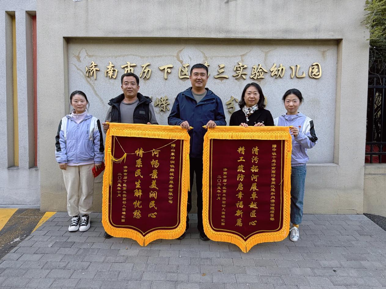 近日,济南市历下区第三实验幼儿园嵘汇园师生代表,向大辛河综合治理项目参建人员送锦旗,致谢河道 “蝶变”。