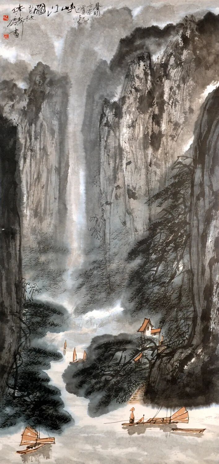 水在中国画的构图体系中向来承载着平衡画面、牵引视线的功能,而吴传麟对水的运用,早已超越了单纯的形式作用。他笔下的水,或为山间蜿蜒的溪流,或为崖边奔涌的飞瀑,或为江面上浩渺的烟波,皆以灵动的线条勾勒走势,以虚实相间的墨色晕染气韵。