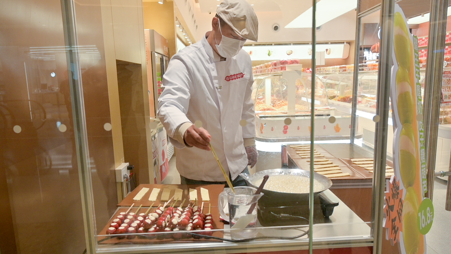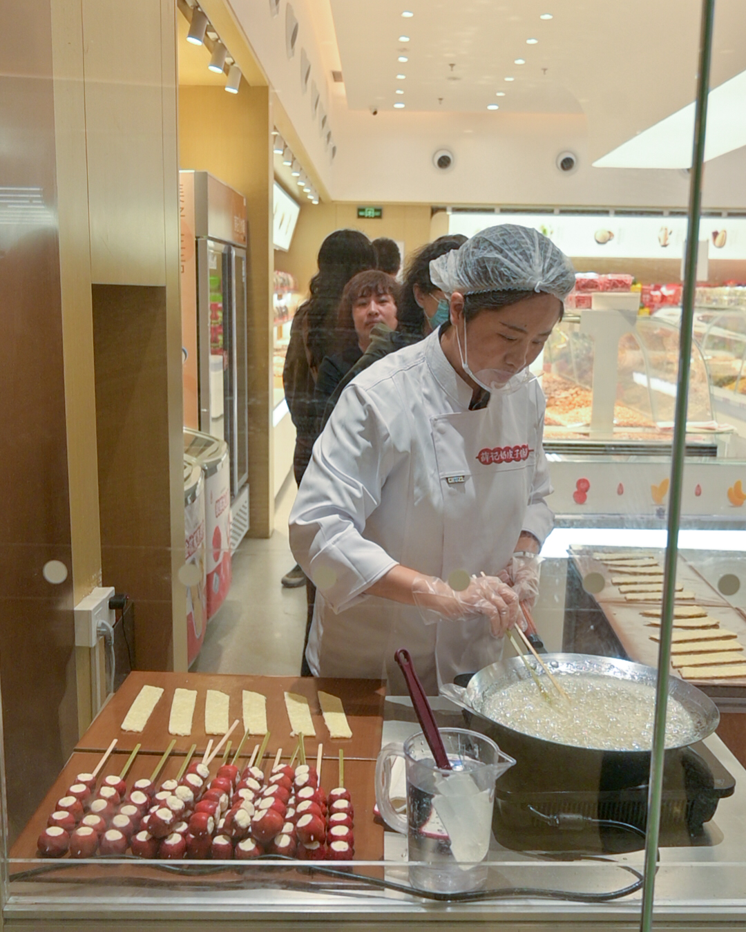 在操作台旁,门店工作人员正有条不紊地做着准备工作。工作人员说,奶皮子糖葫芦制作工艺特殊,得人工现制,没办法像其他食品那样流水化生产,所以制作速度相对慢一些。