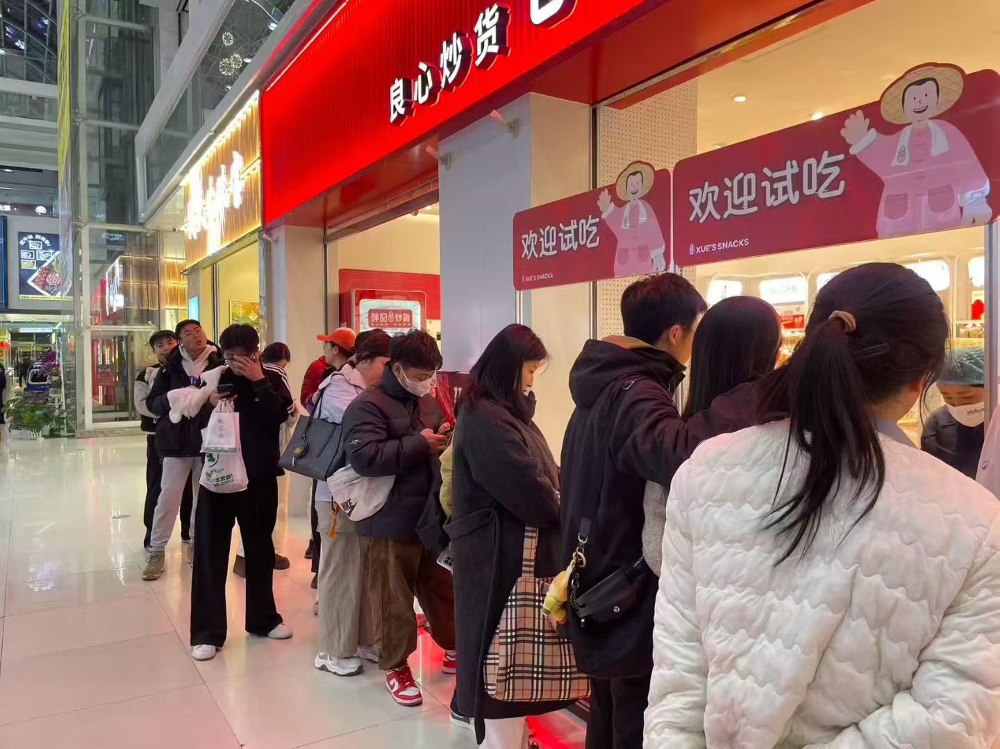 5日上午11时,记者踏入薛记炒货万象城店,瞬间被眼前热闹的景象吸引——店内一处操作台前,虽还未开始制作奶皮子糖葫芦,可排队的长龙已蜿蜒曲折,人群中满是期待的神情。队伍中,消费者林女士满脸笑意,她向记者说道:“我家孩子一直心心念念想吃这奶皮子糖葫芦,可每次来都赶上排队。这次也是听别人说薛记开始卖这个了,就赶紧带着孩子过来,想着无论如何都得买上一些。”
