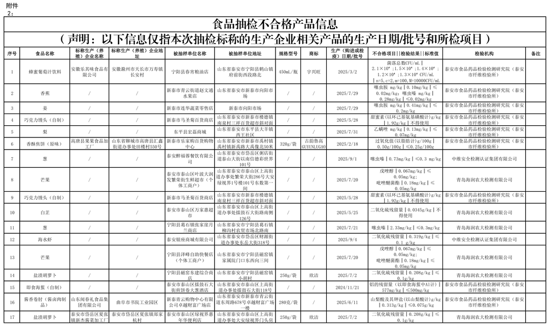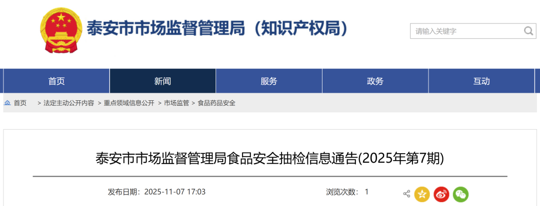 近日,泰安市市场监督管理局网站发布食品安全抽检信息通告(2025年第7期),详情如下: