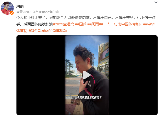 全运会0-4不敌樊振东后,周雨更新微博:今天和小胖比赛了,只能说全力以赴便是圆满。不愧于自己,不愧于赛场,也不愧于对手。后面团体继续加油。