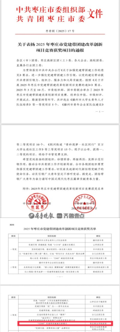 近日,由市委组织部、团市委联合举办的枣庄市2025年党建带团建改革创新项目竞赛结果公布,枣庄职业学院申报的“12345”党建带团建建设新模式凭借鲜明特色、扎实成效和创新价值,从众多参赛项目中脱颖而出,荣获竞赛二等奖,彰显了学院在党团共建领域的探索成果。