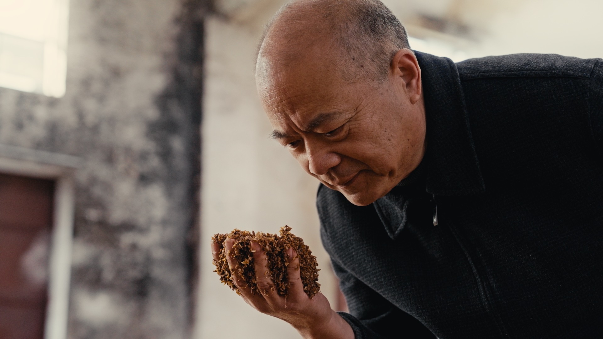 工坊内,酒香与粮香交织弥漫,师傅们手持铁锨,正有条不紊地对五粮和经过一轮发酵的酒醅进行摊晾、翻拌等操作。铁锨起落间,五种原粮和酒醅铺展成均匀的薄层,裹挟着阳光的气息,在师傅们的巧手之下反复翻动,每一个动作都娴熟而沉稳。