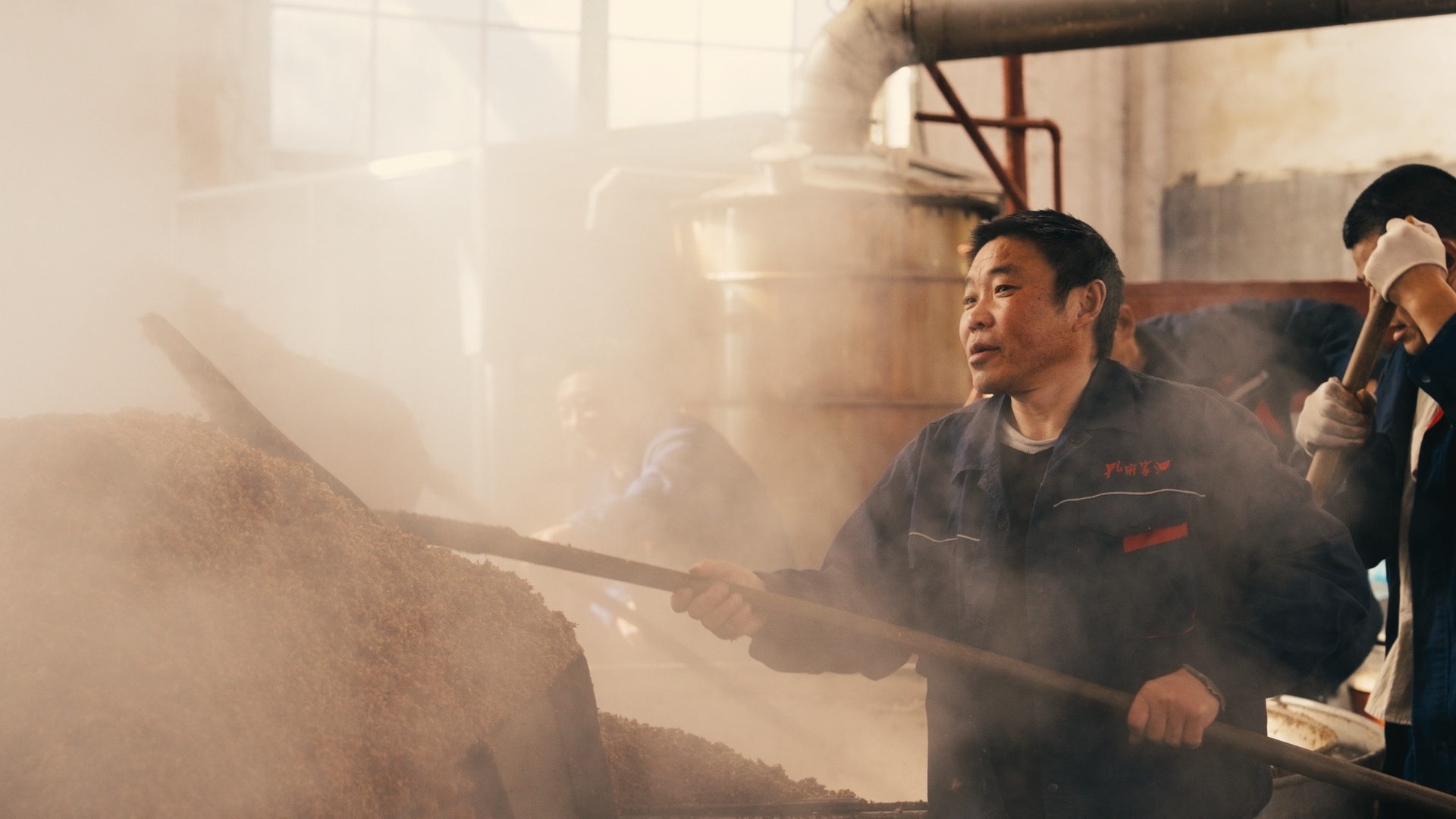 目光移至工坊另一侧,一口硕大的甑锅正冒着氤氲热气,粮香与酒香在空气中交织升腾,两名师傅围站锅边,正专注地重复着“轻撒匀铺”的经典动作。铁锨舀起备好的粮醅,手腕轻扬,细润的物料便如碎玉般均匀洒落,覆盖在甑锅之上,每一次撒铺都力道匀称、厚薄一致,动作行云流水,尽显功底。