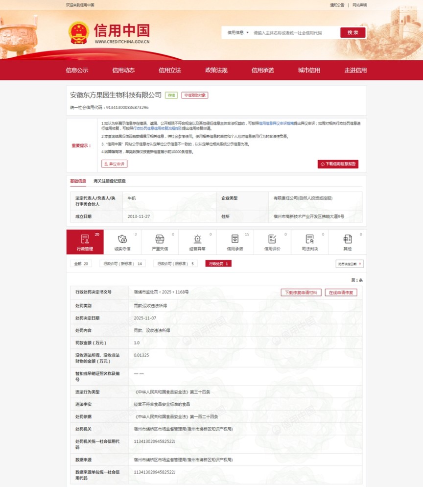 齐鲁晚报·齐鲁壹点记者于信用中国行政处罚信息栏获悉,11月7日,安徽东方果园生物科技有限公司(下称“东方果园”)收到罚单,该公司旗下拥有健康果蔬脆干品牌“东方果园”等。据悉,其处罚类别为“罚款;没收违法所得”,处罚机关为宿州市埇桥区市场监督管理局(宿州市埇桥区知识产权局)。