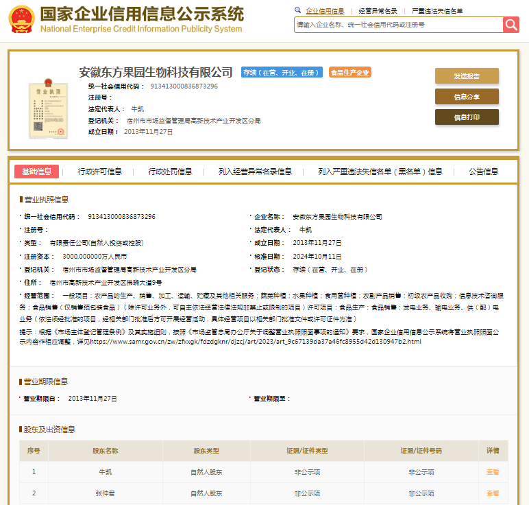 国家企业信用信息公示系统显示,安徽东方果园生物科技有限公司成立于2013年,法定代表人牛凯,注册资本3000万元人民币,大股东为张仲君。