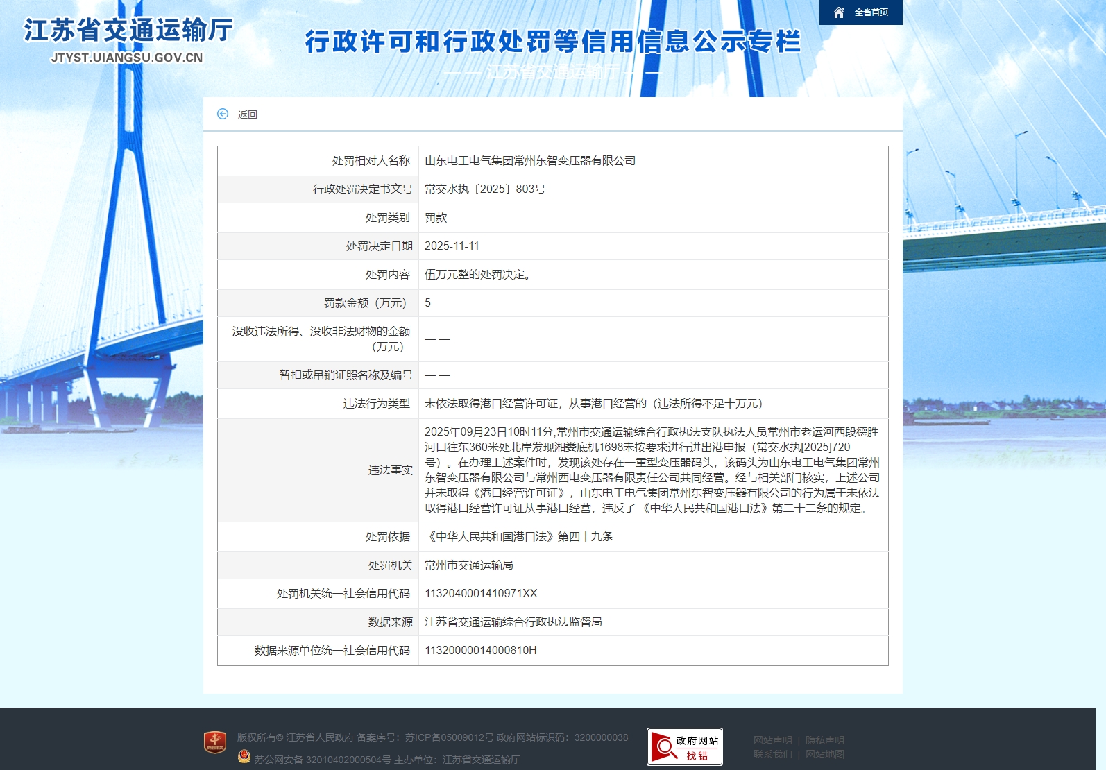 近日,常州市交通运输局对山东电工电气集团常州东智变压器有限公司依法作出行政处罚,因该公司未依法取得港口经营许可证从事港口经营,被处以罚款人民币伍万元整。相关行政处罚决定书(常交水执〔2025〕803号)已于2025年11月11日出具。