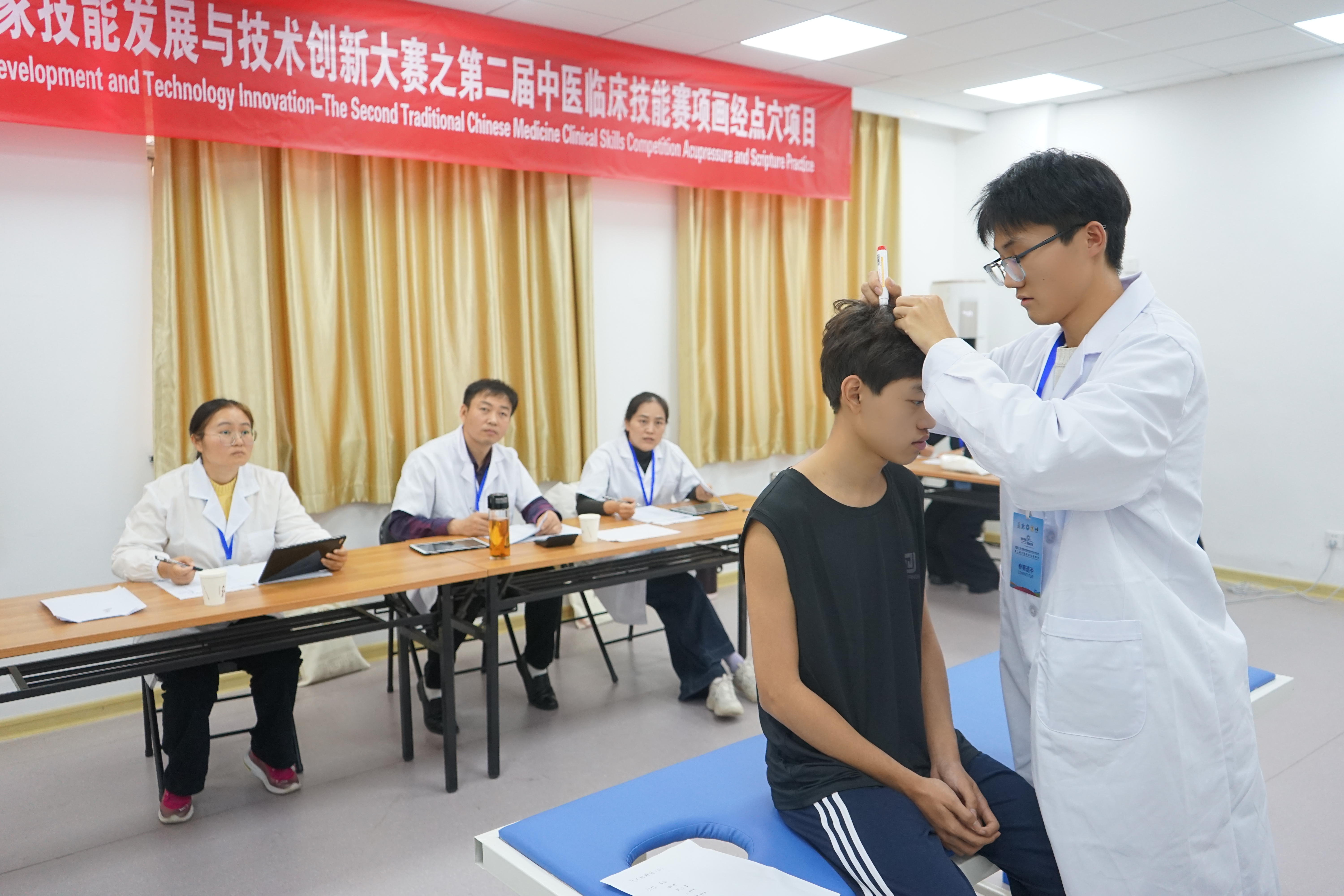 中医理论测试以人机对话形式进行,重点考查选手中医理论与辨证论治能力。在画经点穴赛场,选手们精准绘制经络走向、标注穴位定位,展现对经络腧穴基础知识的熟练掌握;罐法灸法考核中,选手们规范操作拔罐、艾灸技法,注重火候控制与穴位配伍,体现中医外治法的实操精髓;推拿技术赛场,推拿手法娴熟运用,力道刚柔并济,腰背部推拿操作展现出扎实的临床实操能力。裁判专家严格遵循“公平、公正、公开”原则,确保赛事质量。赛场之上,选手们沉着应战、操作娴熟,既展现了扎实的专业技能,又体现了切磋互鉴的良好氛围。