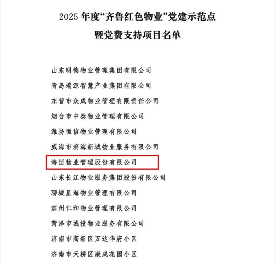 近日,2025年度“齐鲁红色物业”党建示范点暨党费支持项目名单公布,日照市海恒物业管理股份有限公司成功入选。