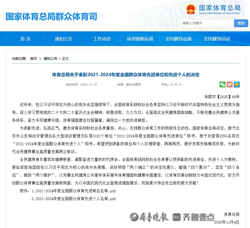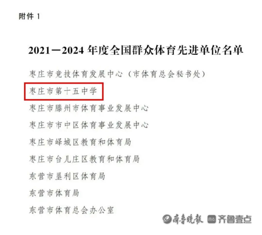 11月10日,国家体育总局发布《体育总局关于表彰2021-2024年度全国群众体育先进单位和先进个人的决定》,枣庄市第十五中学荣获“全国群众体育先进单位”称号,是全市教育系统唯一一所受表彰的学校。