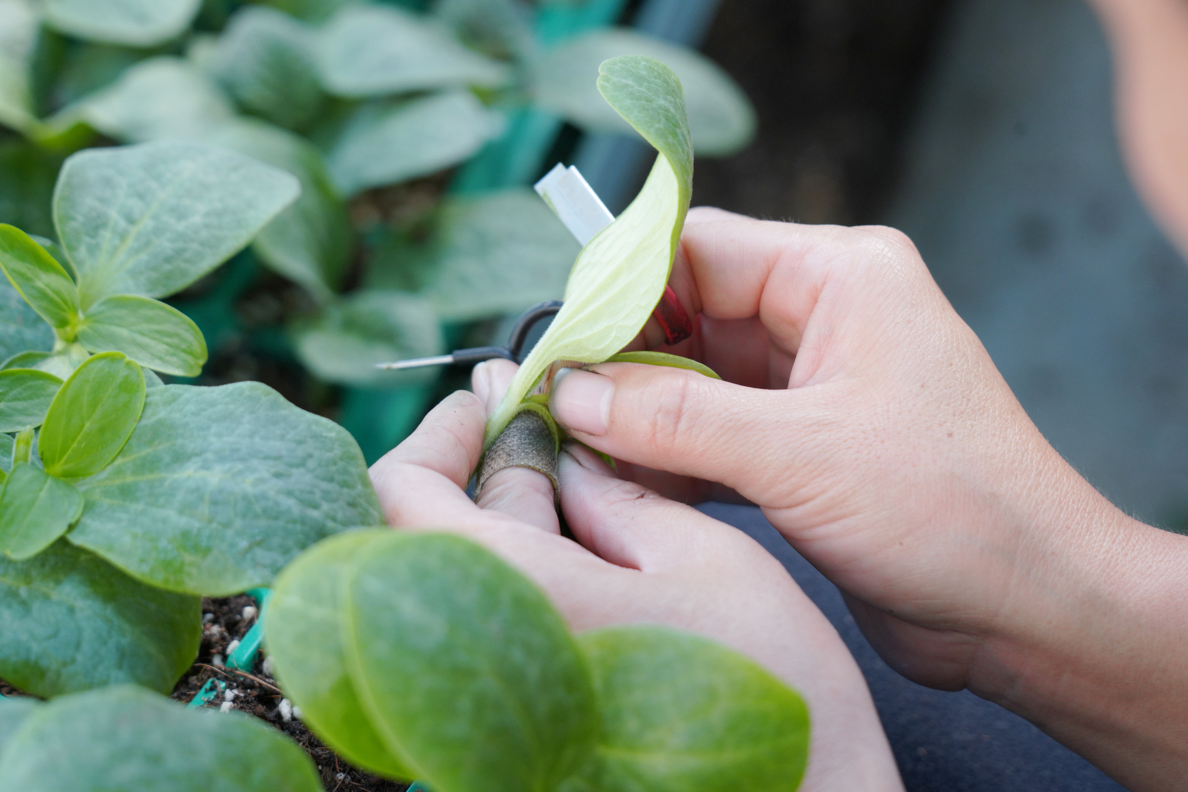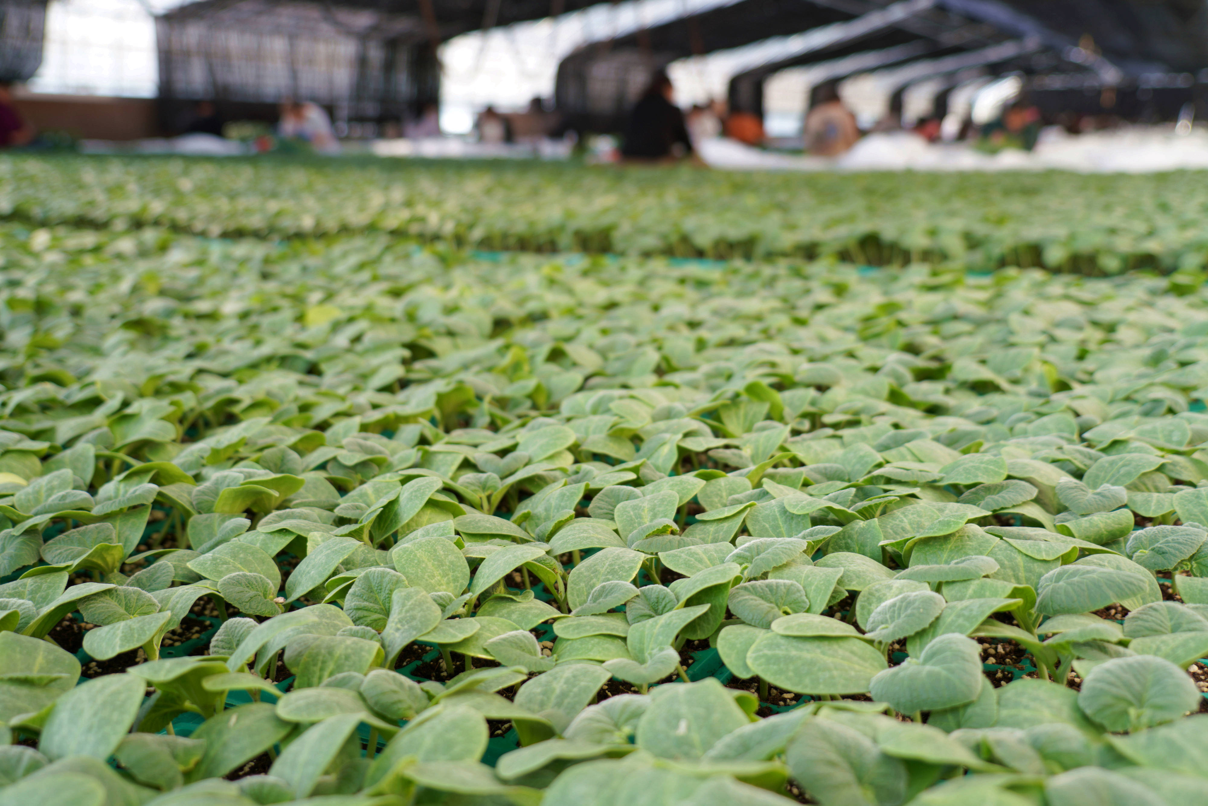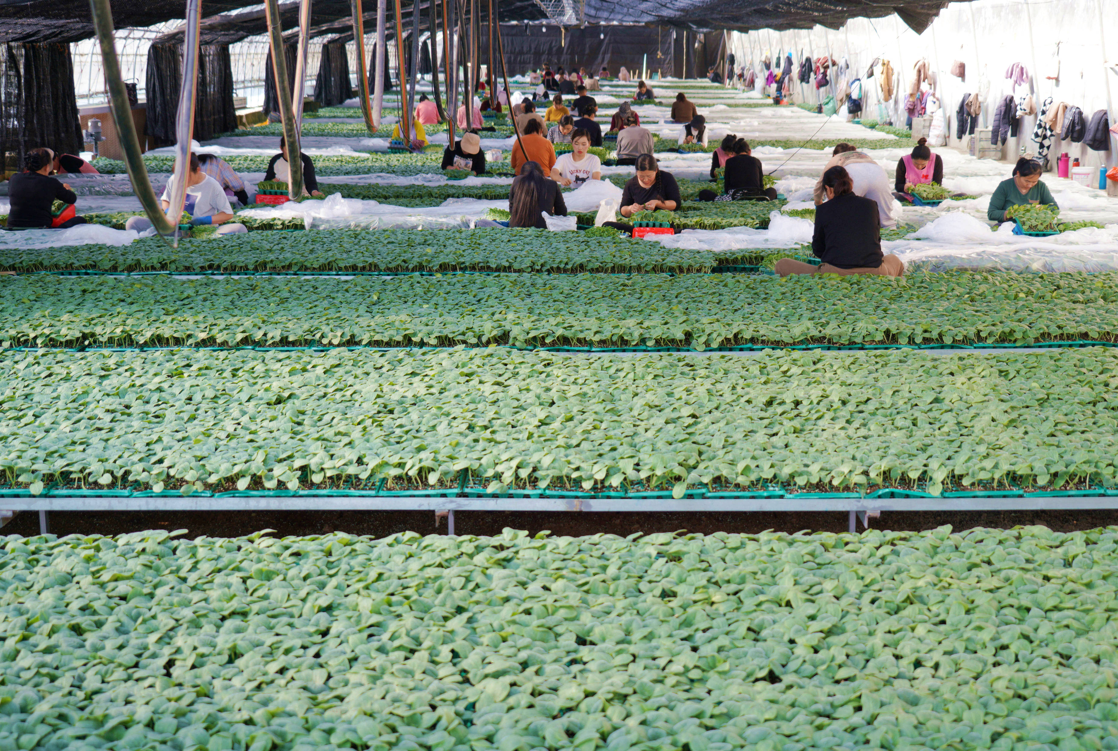 11月12日,在山东省临沂市沂南县依汶镇金马山蔬菜育苗基地,村民在嫁接黄瓜苗。
