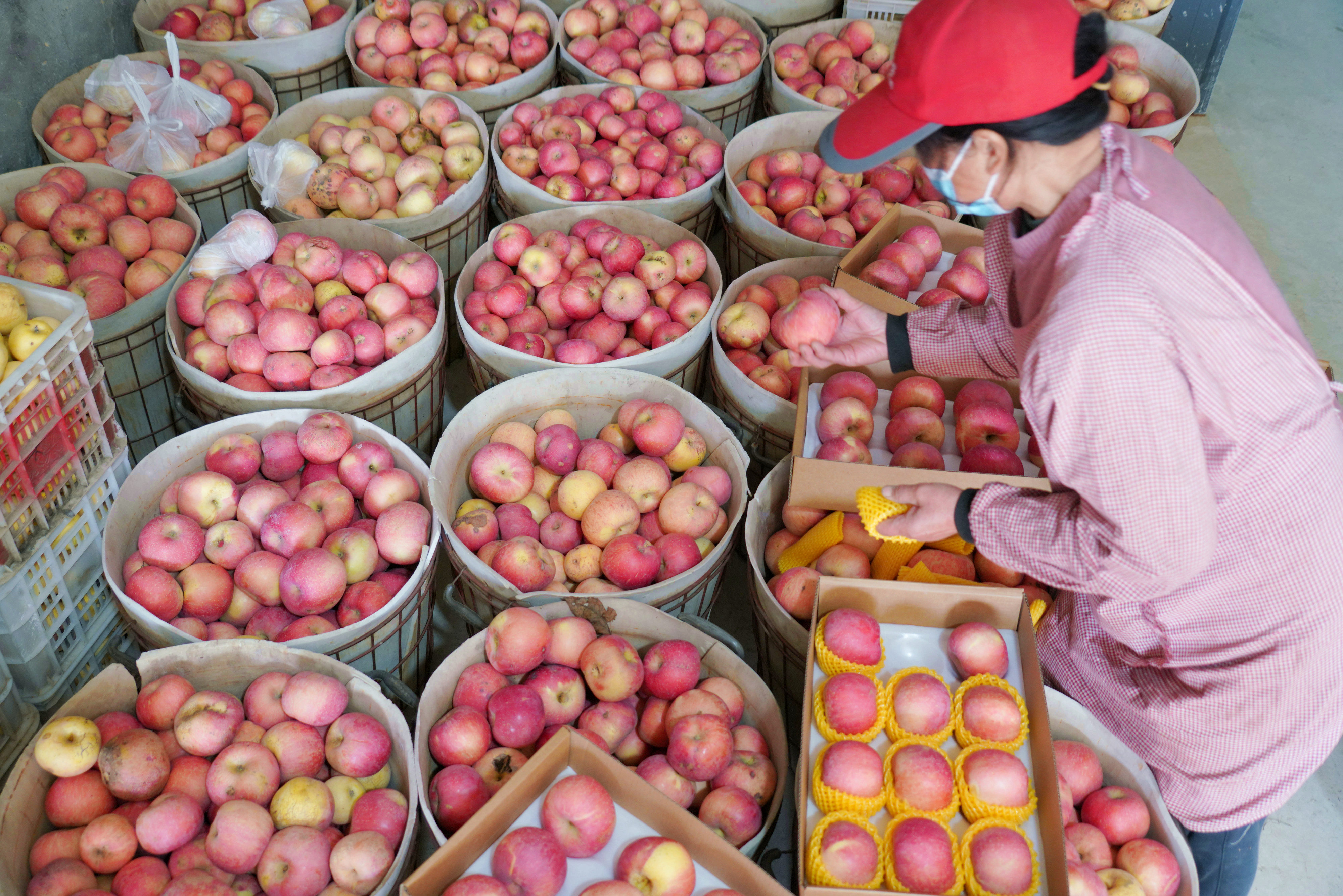 11月12日,山东省临沂市沂南县铜井镇绿丰山庄果品种植专业合作社的果农在分拣采摘的苹果。