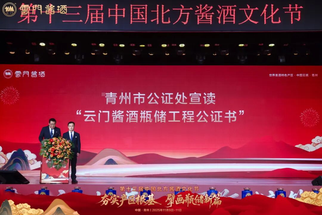 文化节期间,青州市公证处对云门酒业2025年度新增的24132箱瓶储年份酒进行了公证,并现场宣读“2025年度云门酱酒瓶储工程公证书”。截止2025年11月,云门酱酒瓶储工程共储存瓶储酒23万箱。