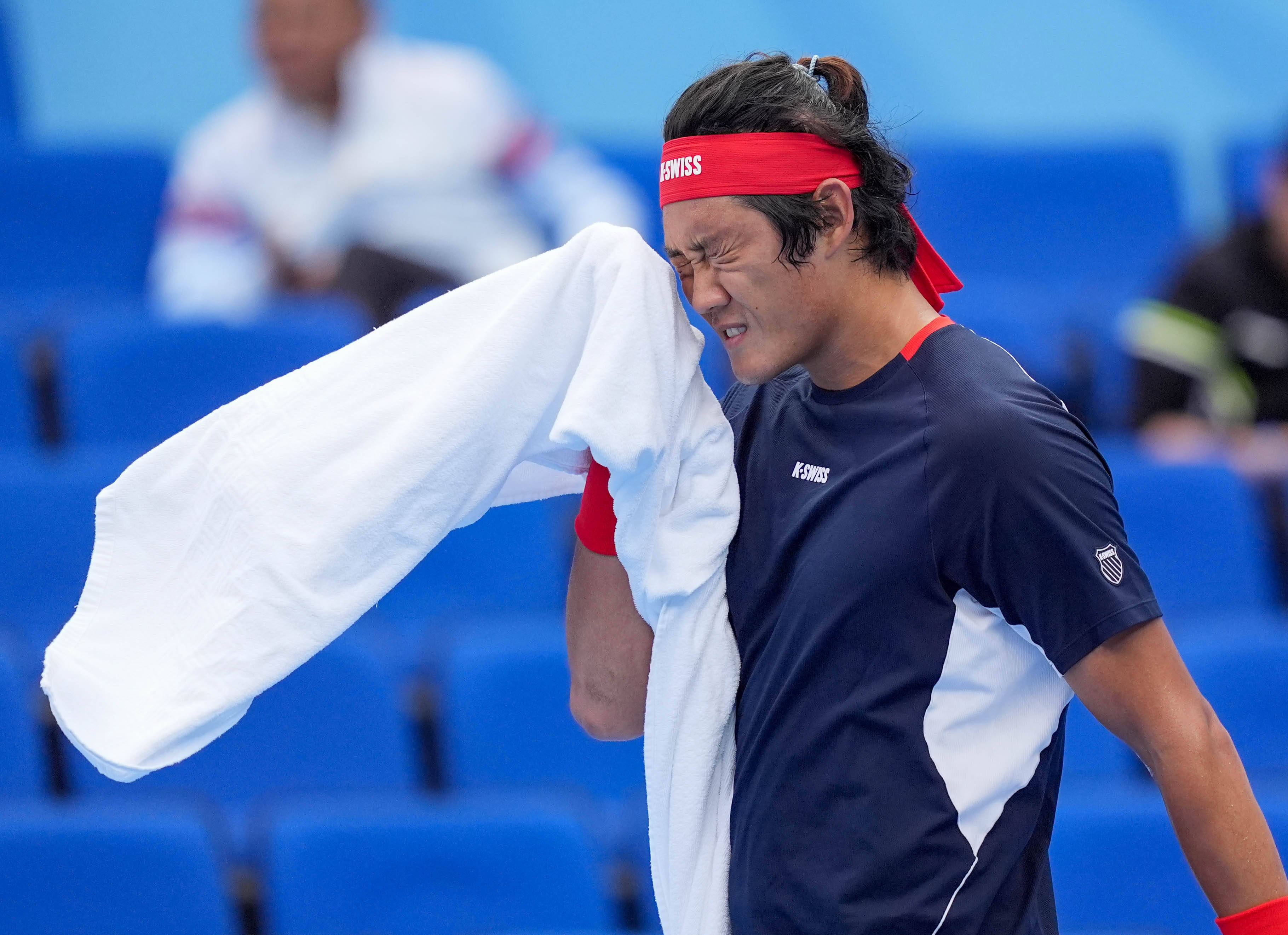 11月13日,上海队选手张之臻在男子单打比赛间歇用毛巾擦汗。最终,他2比0战胜湖南队选手周洺舟,晋级下一轮。 新华社记者 颜麟蕴 摄