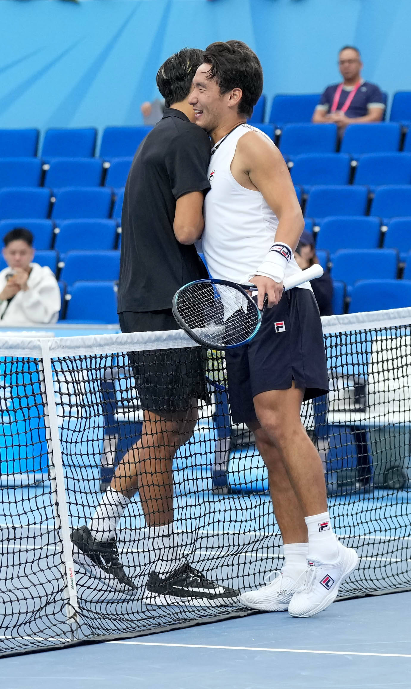 11月13日,浙江队选手布云朝克特(右)与江苏队选手孙浅在赛后拥抱。 最终,布云朝克特2比0战胜孙浅,晋级下一轮。 新华社记者 颜麟蕴 摄