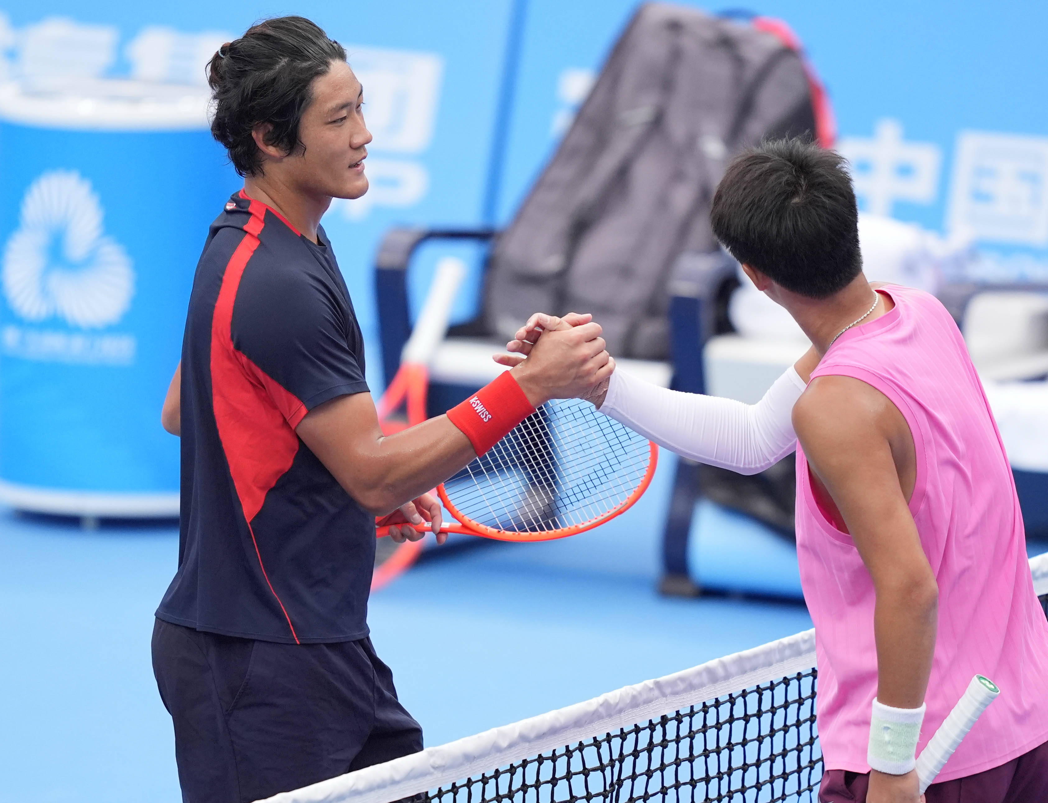 11月13日,上海队选手张之臻(左)与湖南队选手周洺舟在赛后握手致意。 最终,张之臻2比0战胜周洺舟,晋级下一轮。 新华社记者 颜麟蕴 摄