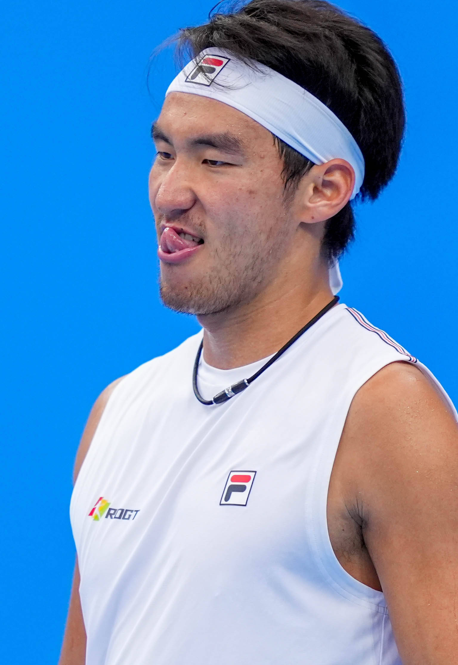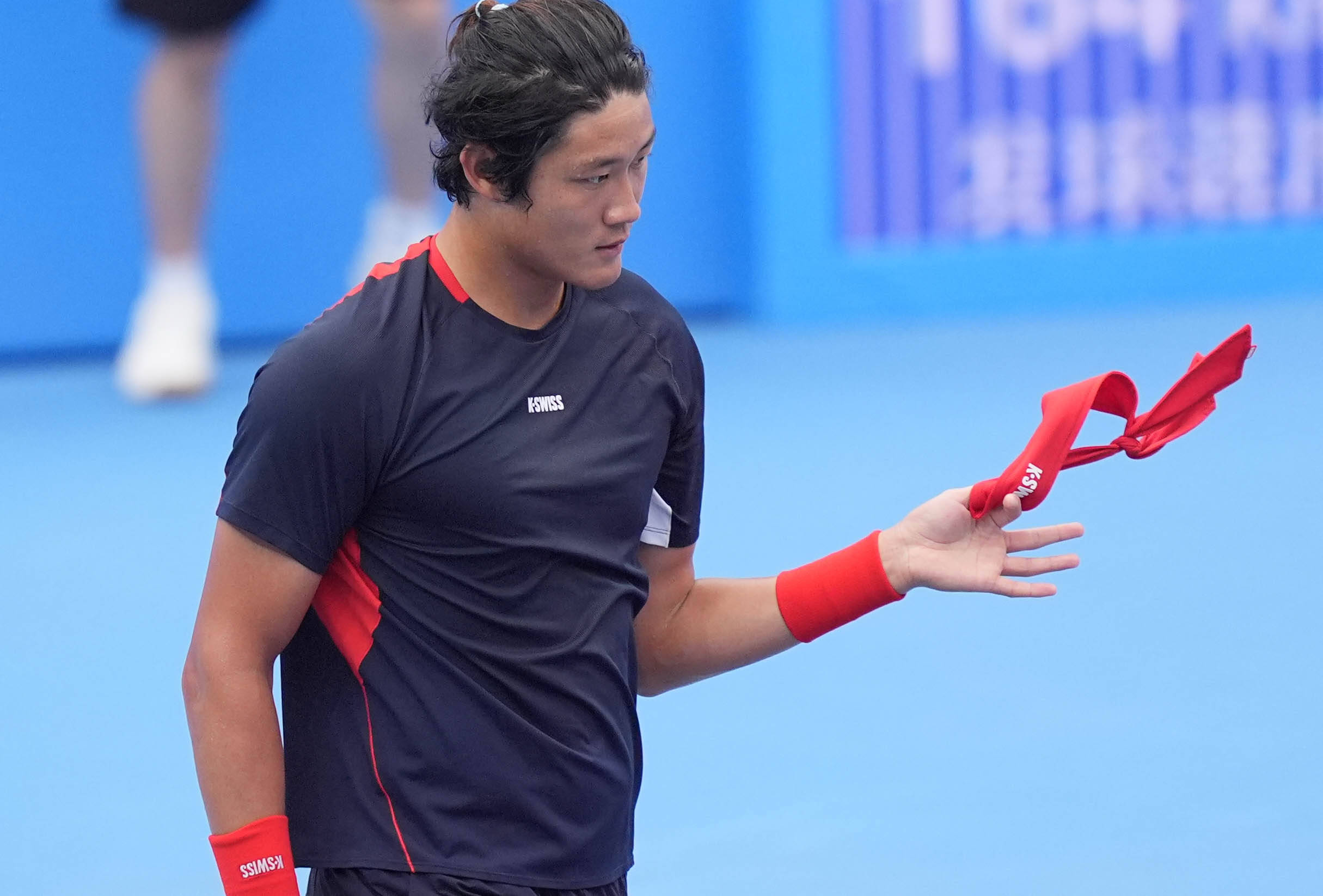 11月13日,上海队选手张之臻在男子单打比赛结束后取下头巾。最终,他2比0战胜湖南队选手周洺舟,晋级下一轮。 新华社记者 颜麟蕴 摄