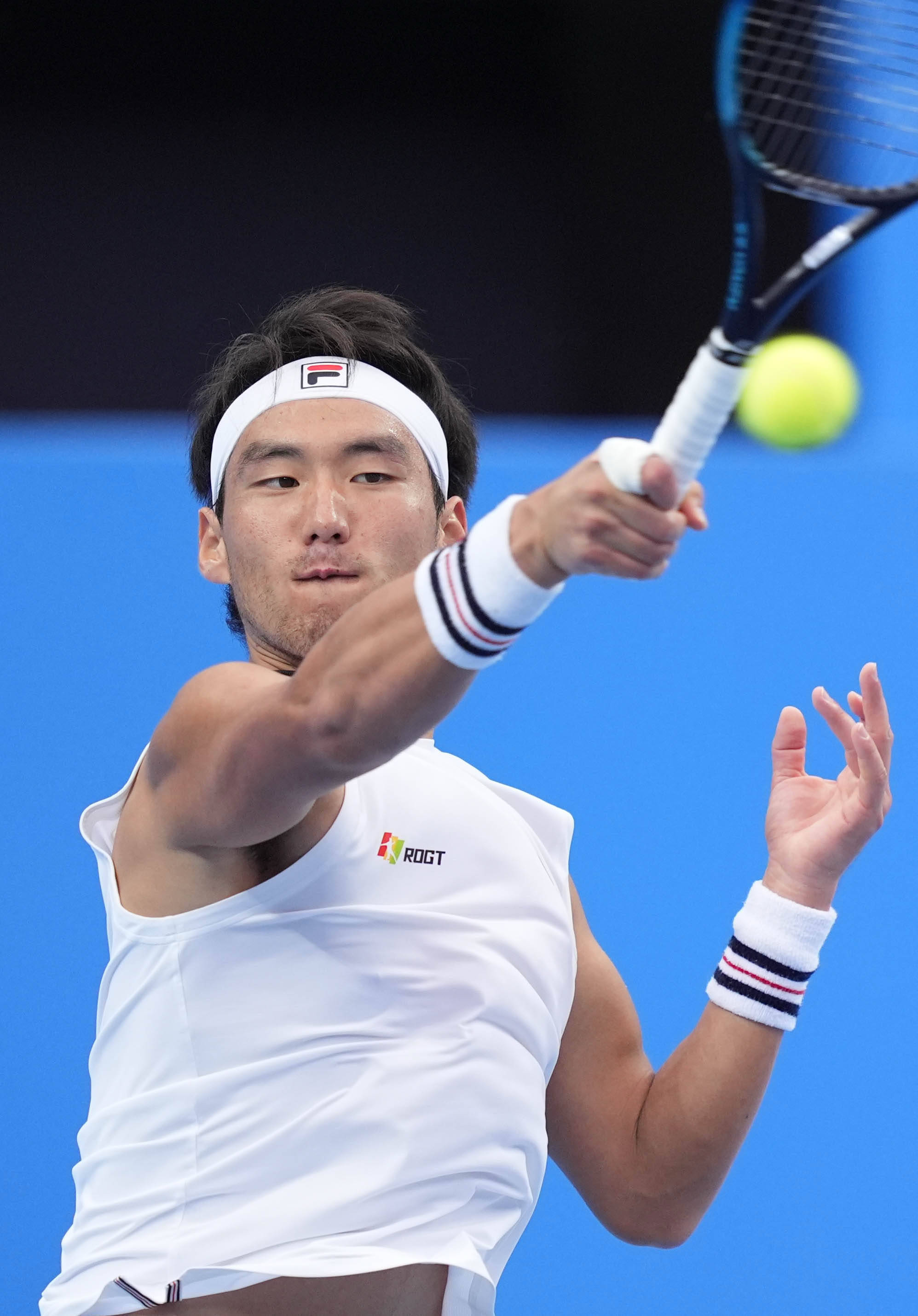 11月13日,浙江队选手布云朝克特在男子单打比赛中回球。最终,他2比0战胜江苏队选手孙浅,晋级下一轮。 新华社记者 颜麟蕴 摄
