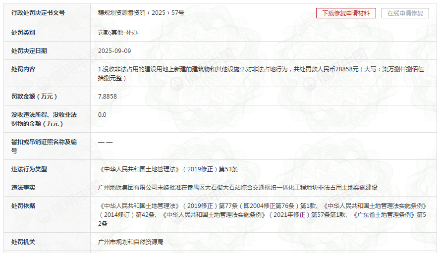 齐鲁晚报·齐鲁壹点记者注意到,这是广州地铁集团在今年9月以来,第4次因“未批先建”等被罚。穗规划资源番资罚﹝2025﹞57号显示,9月9日,其因“未经批准在番禺区大石街大石站综合交通枢纽一体化工程地块非法占用土地实施建设”,被罚7.8858万元并没收非法占用的建设用地上新建的建筑物和其他设施;