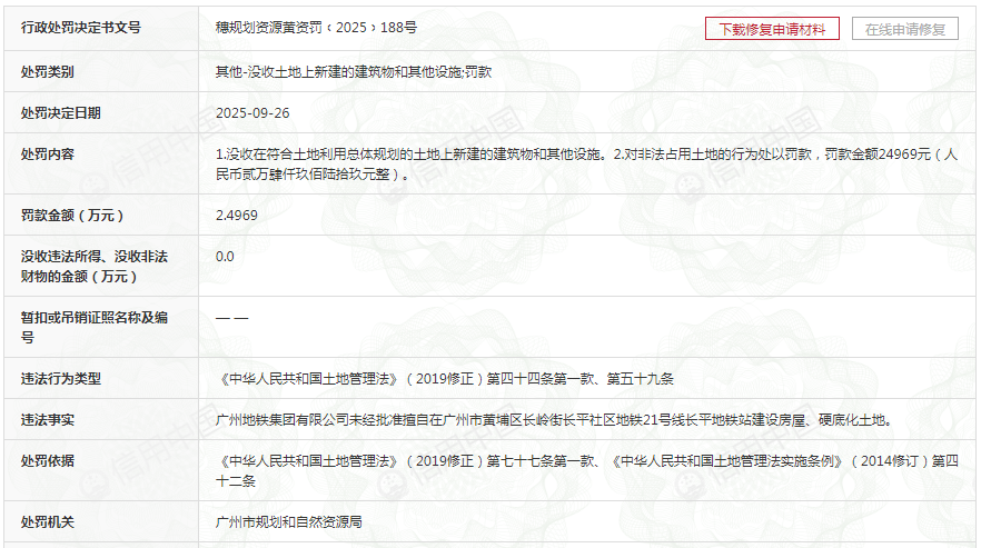 穗规划资源黄资罚﹝2025﹞188号显示,9月26日,其因“未经批准擅自在广州市黄埔区长岭街长平社区地铁21号线长平地铁站建设房屋、硬底化土地”,被罚款2.4969万元并没收在符合土地利用总体规划的土地上新建的建筑物和其他设施;