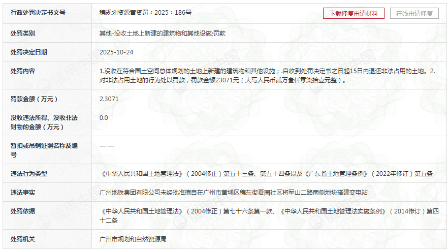 穗规划资源黄资罚﹝2025﹞186号显示,10月24日,其又因“未经批准擅自在广州市黄埔区穗东街夏园社区将军山二路南侧地块搭建变电站”,被罚2.3071万元并没收在符合国土空间总体规划的土地上新建的建筑物和其他设施,处罚机关责令其自收到处罚决定书之日起15日内退还非法占用的土地。