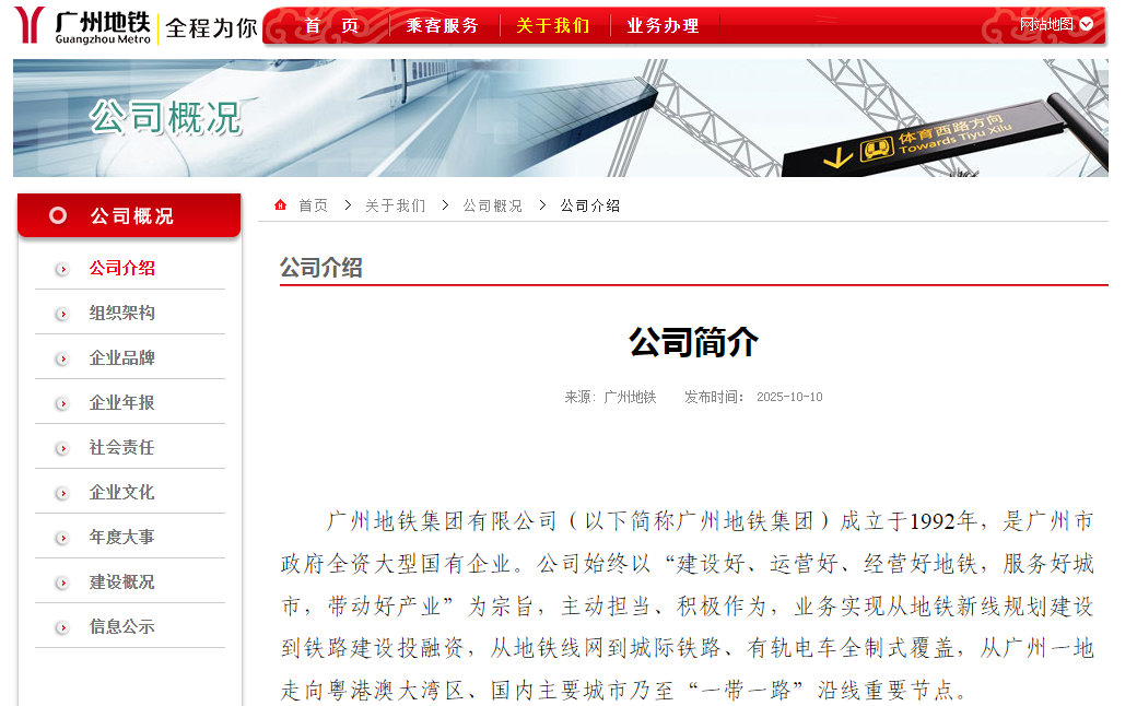广州地铁集团官网介绍,公司是广州市政府全资大型国有企业,目前,广州地铁集团运营的轨道交通里程约1403公里,除了本地地铁线网768.4公里、有轨电车26.3公里外,还包括城际铁路420.5公里,以及巴基斯坦拉合尔橙线、长沙地铁六号线等外地项目188公里。公司实施多元化经营开发,成功打造万胜广场、荔胜广场、悦江上品等多个商业与住宅项目。下属控股子公司广州地铁设计研究院股份有限公司成功上市(股票代码:003013),成为国内第一个登陆A股资本市场的地铁设计院。