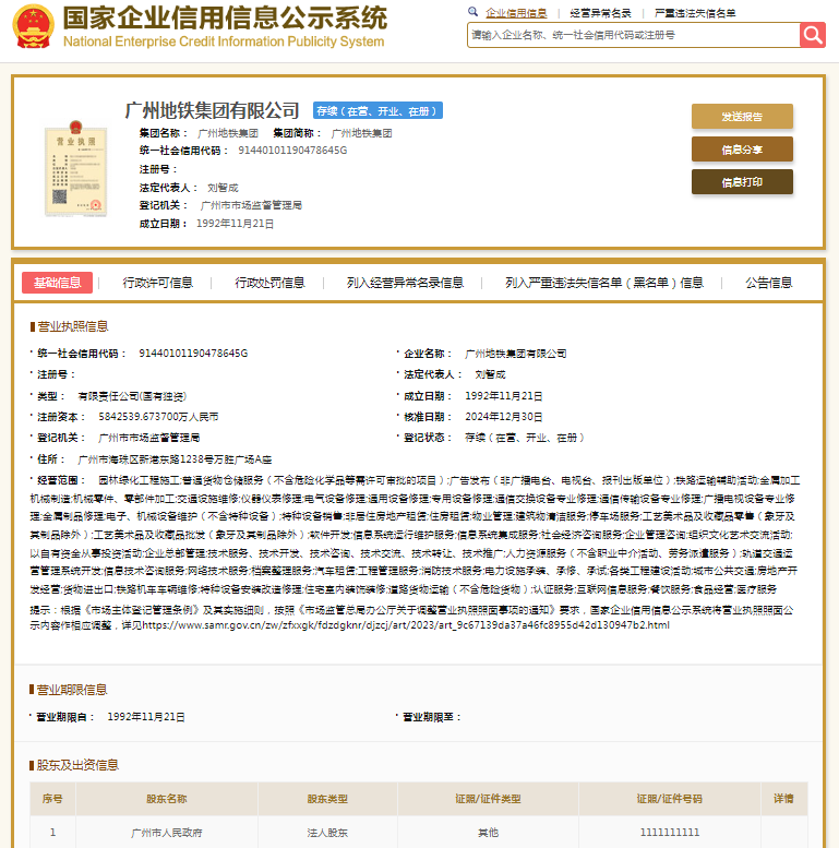 国家企业信用信息公示系统显示,广州地铁集团有限公司成立于1992年,法定代表人刘智成,注册资本5842539.6737万元人民币。