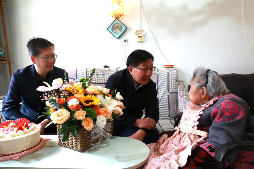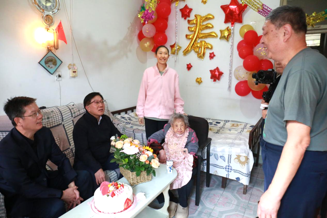 当日下午,虞老家中暖意融融。邓华亮亲手将书写着“积善延年,仁爱笃厚” 的贺寿对联张贴于堂前,这八个字既是对老人百岁寿辰的美好祝愿,更精准概括了她一生践行的品格操守。邓华亮、贾新华详细询问老人生活状况,盛赞“虞老既是战火淬炼的药品守护者,更是医院药学事业的奠基人”,院领导叮嘱家属悉心照料,并要求老干部处建立专属档案,用精细化服务温暖老一辈建设者的晚年。随后,工作人员献上定制的生日蛋糕与盛放的鲜花,岁月在老人饱含笑意的眼眸中定格成温暖的风景。