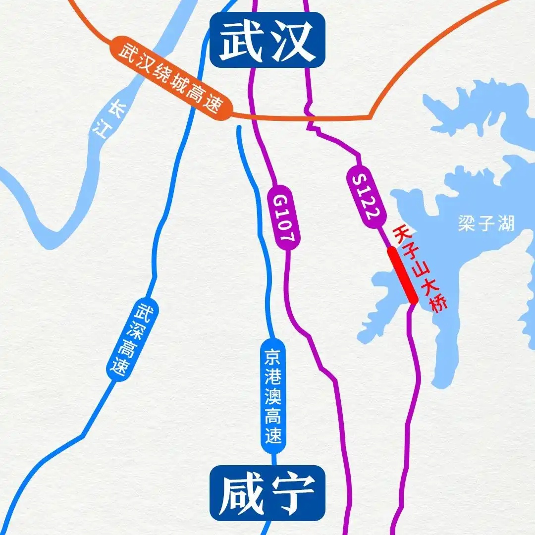 天子山大桥建成后,将S122公路两岸连接,梁子湖南北两岸居民通行时间将由原本绕行1个小时,缩短至2分钟直达。同时咸宁至武汉车程也将缩短至1小时左右。