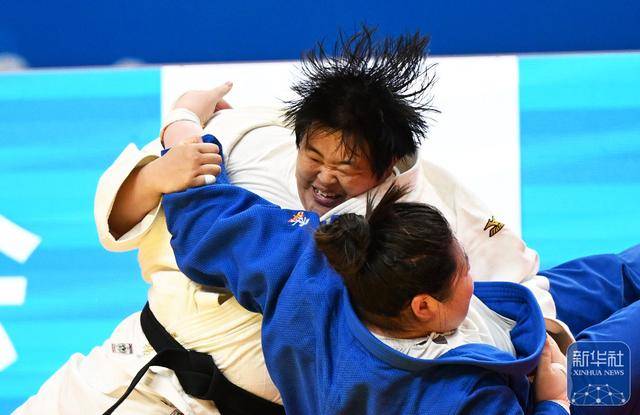 ↑ 山东队选手姜雅楠(左)与江苏队选手徐仕妍在女子70公斤以上级比赛中。姜雅楠战胜徐仕妍。