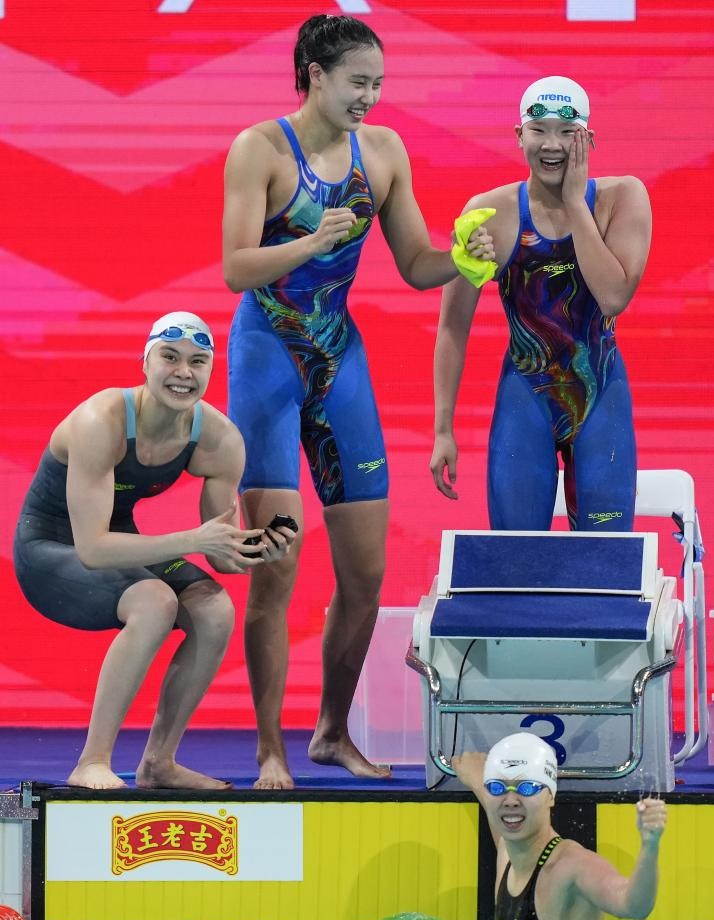 当日泳池最后一战,是女子100米自由泳接力。无庸置疑,浙江队又是天团组合,朱梦惠领衔,余依婷、柳雅欣、吴卿风压阵,山东队则是以奥运冠军杨浚瑄压阵,带着王一淳、葛楚彤和14岁的“小孩姐”张昕煜出战。从纸面实力上看,山东队前三棒实力处于下风,但是王一淳三人不负众望,尤其是第三棒张昕煜紧紧咬住浙江队,用自己的个人最好成绩为杨浚瑄的最后赶超赢得了时间。