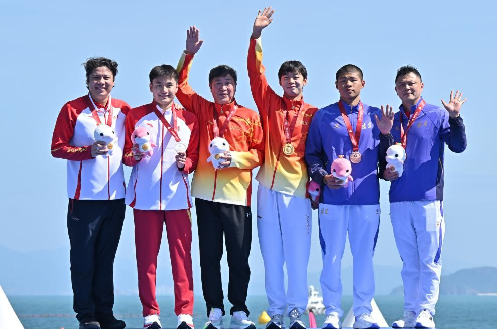 山东著名游泳教练金浩(左一)与他的弟子刘培鑫在本届全运会登上领奖台。新华社发