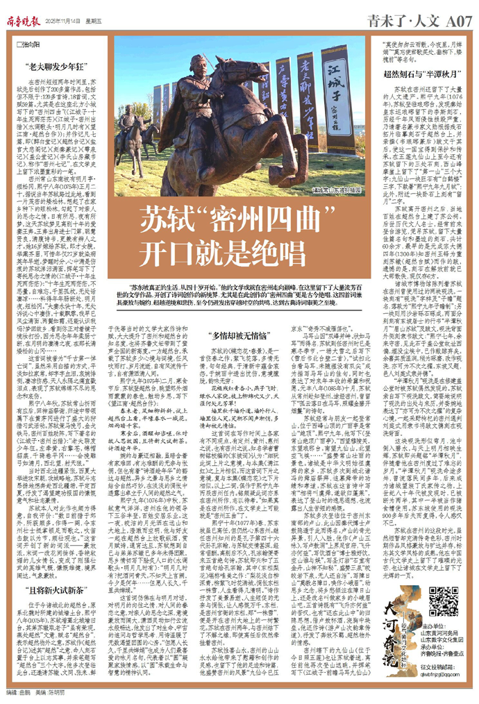 苏轼在密州的这段时光,虽然短暂却充满传奇色彩,密州时期作品风格豪放与旷达并存,标志其文学风格的成熟。他在中国古代文学史上留下了璀璨的光芒,也让诸城在文学史上留下了光辉的一页。