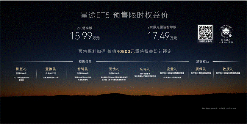 预售期间,星途ET5为下定用户准备了总价值高达40800元的重磅福利,多项预售专属礼遇现已开启:下订1000元可抵3000元购车款、全系6000元置换补贴、价值28800元的猎鹰700辅助驾驶功能终身免费、专属4000元智能辅助驾驶无忧权益限时赠送(限210激光雷达智尊版)以及官方商城7kW智能家充桩半价尊享。同时,星途还为首任车主提供三大基础权益,包括终身免费基础流量,3年10G/月娱乐流量、整车终身质保及终身免费道路救援服务,以满格诚意打造预售期用户的尊享购车体验。