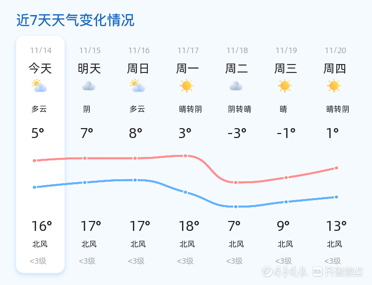 未来三天,枣庄市天气将以多云为主,气温总体平稳,最高气温可达17℃,最低气温为5℃。11月17日起,气温将有所下降,市民需关注天气变化,及时调整着装,尤其是老人和儿童,注意保暖。