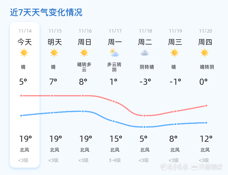 未来三天,济宁市天气趋势总体平稳。周日(11月16日)天气晴转多云,气温范围在8℃至19℃之间;周一(11月17日)多云转阴,北风风力增强至3-4级,气温有所下降,最低气温为1℃,最高气温为15℃;周二(11月18日)阴转晴,气温显著下降,最低气温为-3℃,最高气温仅为5℃。市民需注意防范降温带来的影响,特别是周一的北风和周二的低温,出行时应做好保暖措施。