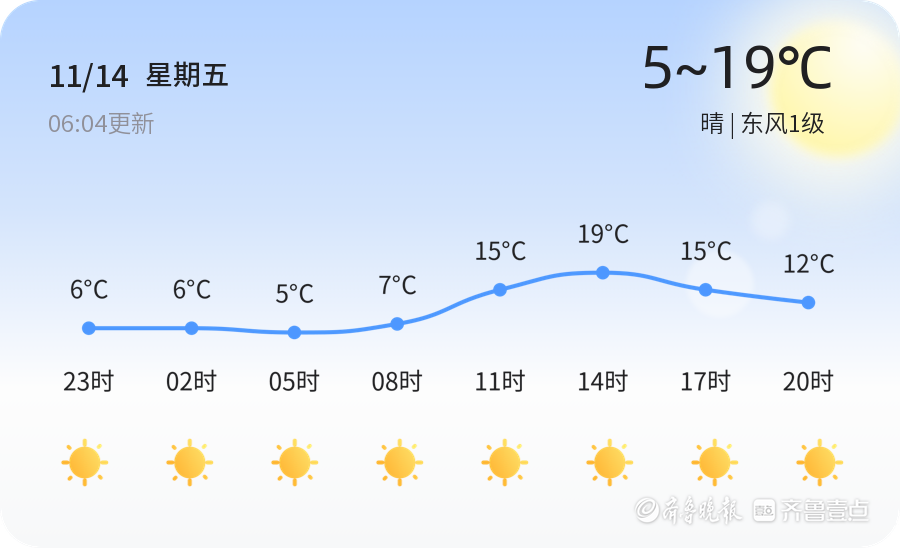 今天是11月14日,星期五,农历九月廿五。济宁市迎来晴好天气,气温适宜,全市各区的天气状况总体良好。今天最高气温为19℃,最低气温为5℃,当前气温为6.6℃,风向为东风1级,空气湿度为83%,PM2.5指数为70,空气质量良好。