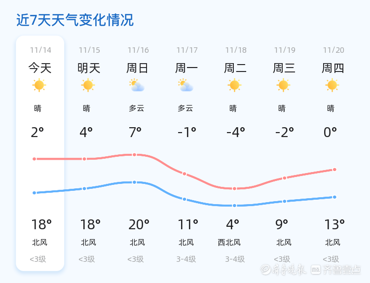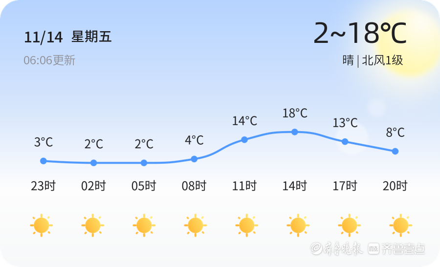 今天是11月14日,星期五,农历九月廿五。滨州迎来晴好天气,气温在2摄氏度到18摄氏度之间,北风1级,空气湿度较高,PM2.5指数为77,空气质量良好。各区天气情况基本一致,均为晴天,适合市民户外活动。