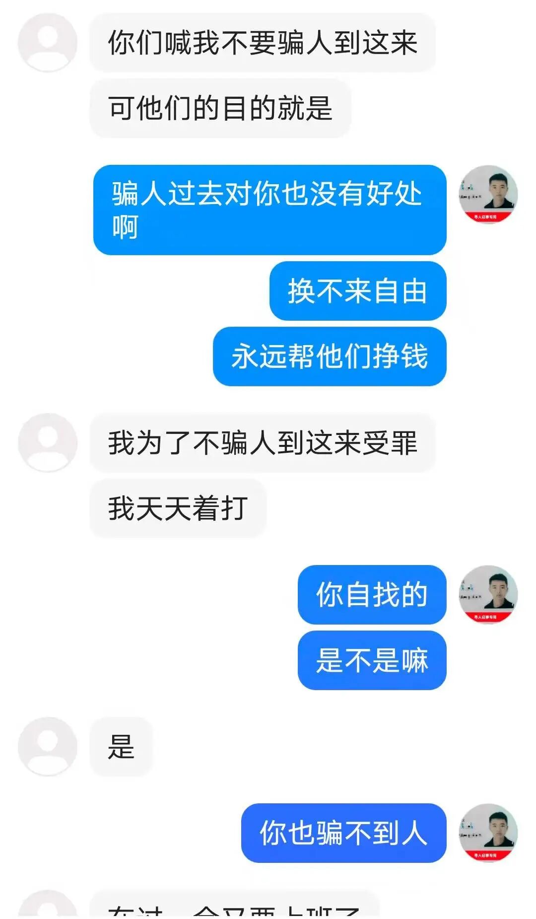 胡女士提供的一段聊天记录显示,王子涵称,他“每天上十几个小时的班,熬不住”“我为了不骗人到这来受罪,天天遭打”“干不好有可能要遭杀”,他表示现在很后悔,“我现在没有回头路了吗”。