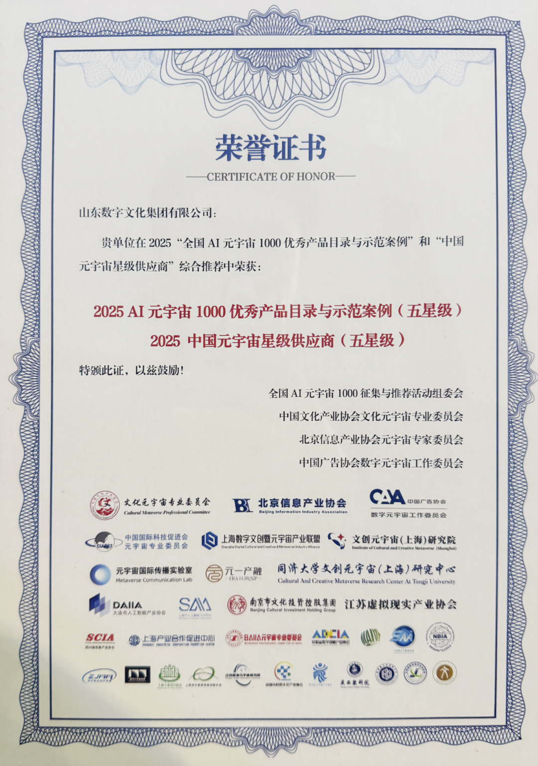 11月22日,2025 AI元宇宙产业供需对接大会暨第一届数字文化产教融合大会在上海启幕。活动期间,发布《2023-2025全国AI元宇宙1000优秀产品与示范案例征集成果汇编》,山东数字文化集团有限公司荣获“2025中国元宇宙星级供应商(五星级)”荣誉,为最高等级。