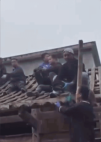 杨胜民:年纪比较大的在下面接瓦,年纪小点的在上面放瓦,有技术有经验的,就在下面把棍子全部绑好。