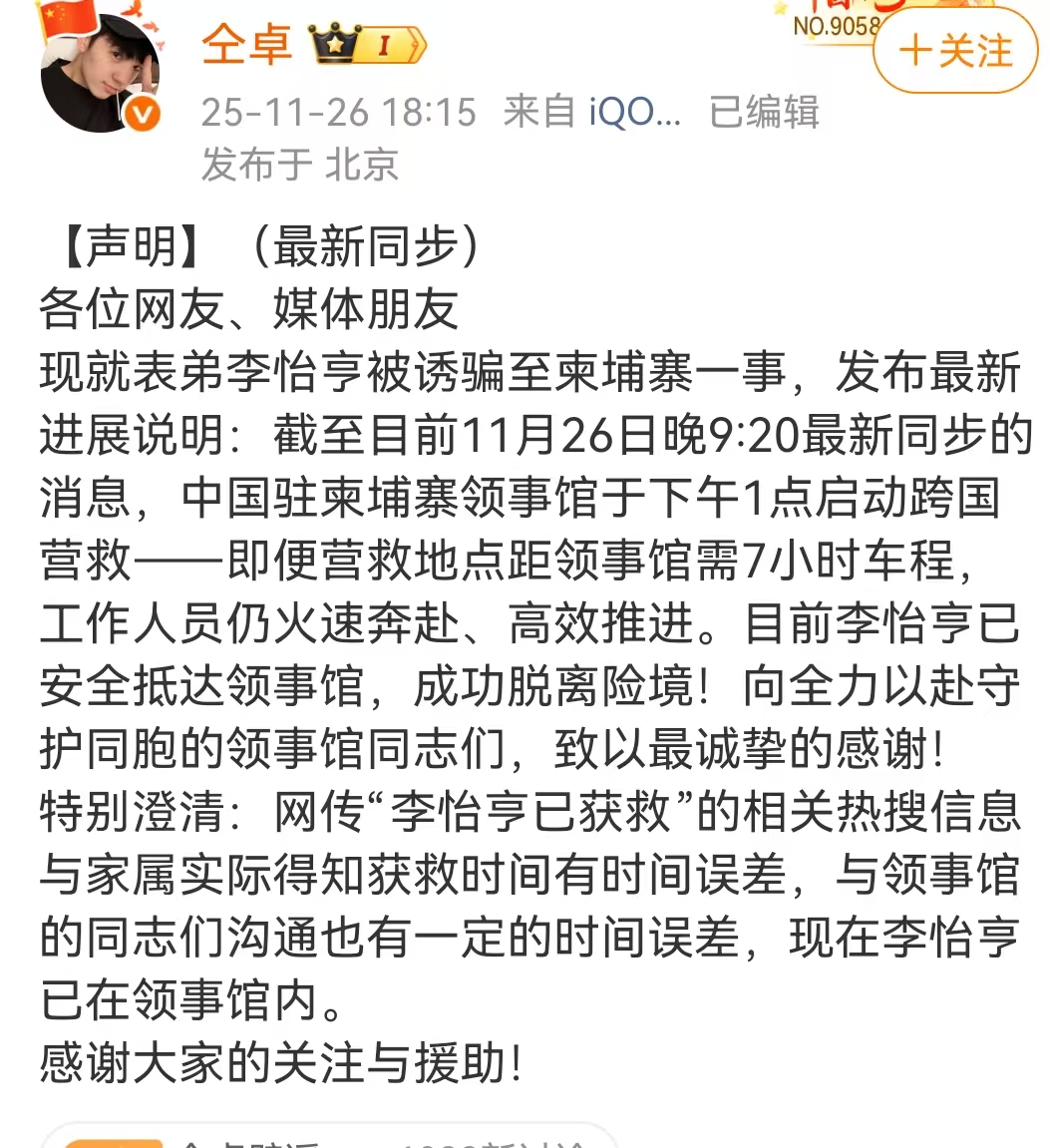 仝卓表弟柬埔寨失联13天,我使馆:在柬失联的中国公民李某某已成功获救