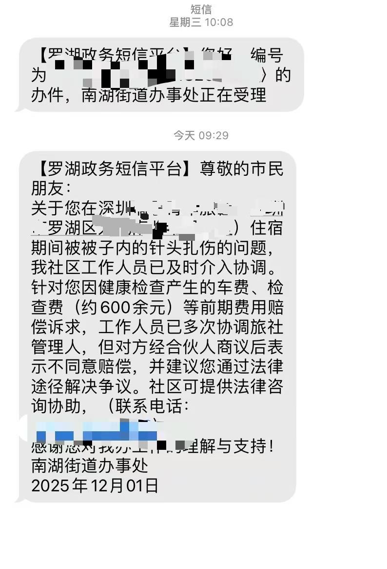 根据该网友此前发帖,11月19日下午,她入住深圳罗湖区某青年旅社,当晚9时12分,她洗漱后上床休息时,脚踝突然被异物扎伤。检查后发现,被子里藏着一根长针,针尖朝外、针柄嵌在被芯中,该网友称这可能是一根针灸用针。随后她选择报警,民警上门调查时,多次向旅社保洁询问这根针的相关情况,保洁均表示从未见过,也不清楚是否为旅社物品。