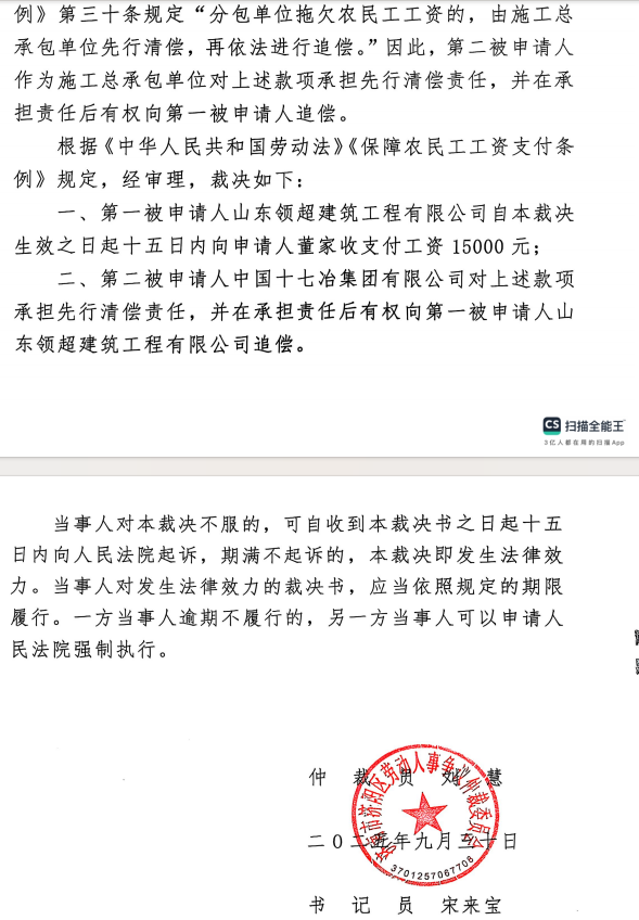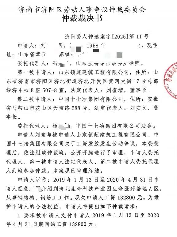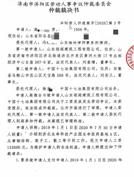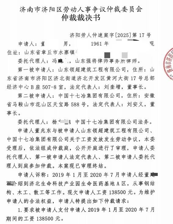 漫长的五年里,工人们多次向区劳动监察大队、信访办等部门求助。2025年9月,济南市济阳区劳动人事争议仲裁委员会作出裁决:要求直接用工方山东领超建筑有限公司支付工资,而总承包方中国十七冶集团有限公司对上述款项承担先行清偿责任。然而,裁决并未换来工资。据反映,十七冶不仅拒不支付,其员工甚至在后续沟通中与农民工代表发生推搡冲突。
