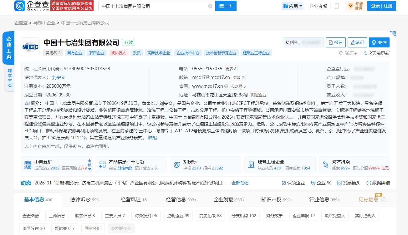 据公开资料显示,中国十七冶集团有限公司成立于2006年,是国有企业,总部位于安徽省马鞍山市,在青岛设有山东分公司。公司主营业务包括EPC工程总承包、装备制造及钢结构制作、房地产开发三大板块,具备多项工程施工总承包特级资质和设计资质。业务范围涵盖房屋建筑、冶炼工程、公路工程、市政公用工程、机电安装工程等领域。